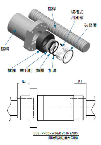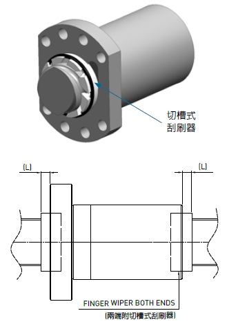 針對(duì)應(yīng)用于特殊環(huán)境( 如:鐵屑,木屑,石墨...等)的滾珠絲杠,為了避免異物侵入螺帽內(nèi)部而影響滾珠絲杠的使用,而開發(fā)高防塵滾珠絲桿.