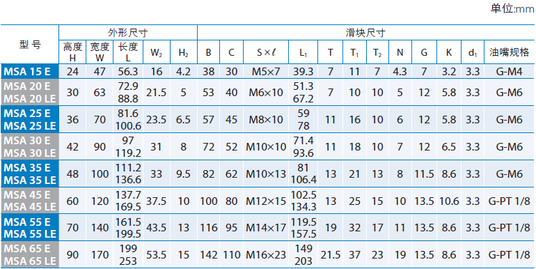 PMI-銀泰直線導(dǎo)軌MSA25E滑塊是一款法蘭型滑塊,也叫帶耳朵的滑塊,滑塊的尺寸為81.6*70,滑塊上有4個M8的螺紋孔,其孔距為57*45,MSA25E滑軌的安裝孔距為60,MSA15E滑塊與滑軌的組合高度為36。所有尺寸完全與臺灣上銀直線導(dǎo)軌HGW25CC相同。兩者之間可相互替換,在防塵方面,銀泰直線導(dǎo)軌比上銀直線導(dǎo)軌做得更佳出色。