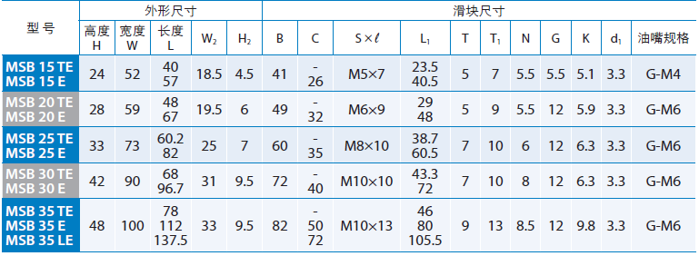 PMI-銀泰直線導(dǎo)軌MSB25TE滑塊是一款低組裝法蘭輕載型滑塊,也被稱作帶耳朵的滑塊,滑塊的尺寸為60.2*73,滑塊上只有2個M8的螺紋孔,其孔距為60,MSB25TE滑軌的安裝孔距為60,MSB25TE滑塊與滑軌的組合高度為33。所有尺寸完全與臺灣上銀直線導(dǎo)軌EGW25SA相同。兩者之間可相互替換,在防塵方面,銀泰直線導(dǎo)軌比上銀直線導(dǎo)軌做得更佳出色。性價比更高.