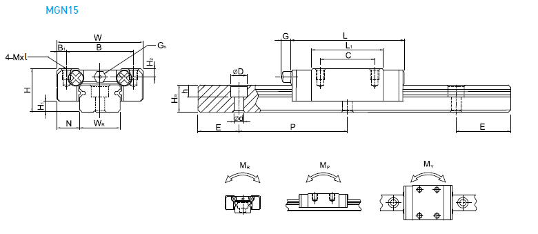 MGN15C滑塊為標(biāo)準(zhǔn)型滑塊,滑塊的大小為42*32,上銀滑塊MGN15C上面有4個(gè)M3的螺紋孔,孔距為25*20,滑軌的安裝螺絲也是M3,安裝孔距為40.滑塊和導(dǎo)軌的組合高度為16